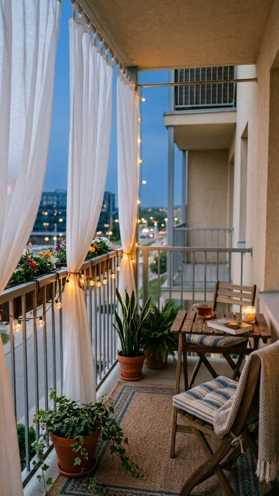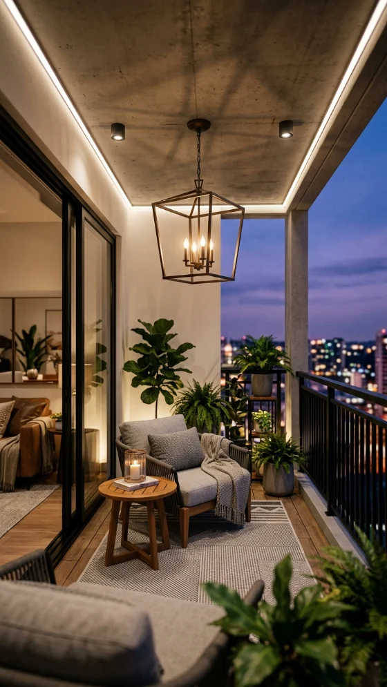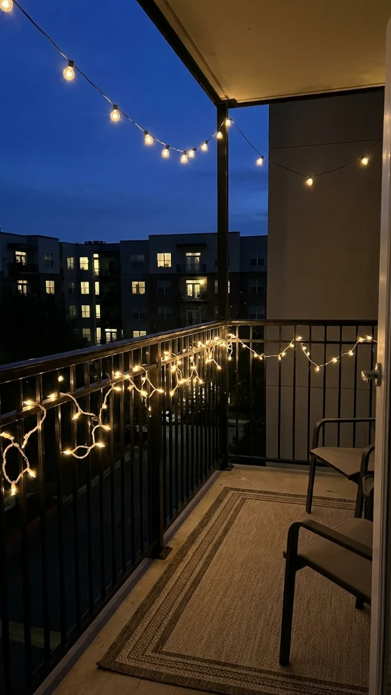 This idea works beautifully for apartment balcony decorating because it adds atmosphere without taking up space. In small balcony decor, soft lighting makes everything feel more inviting and relaxed.