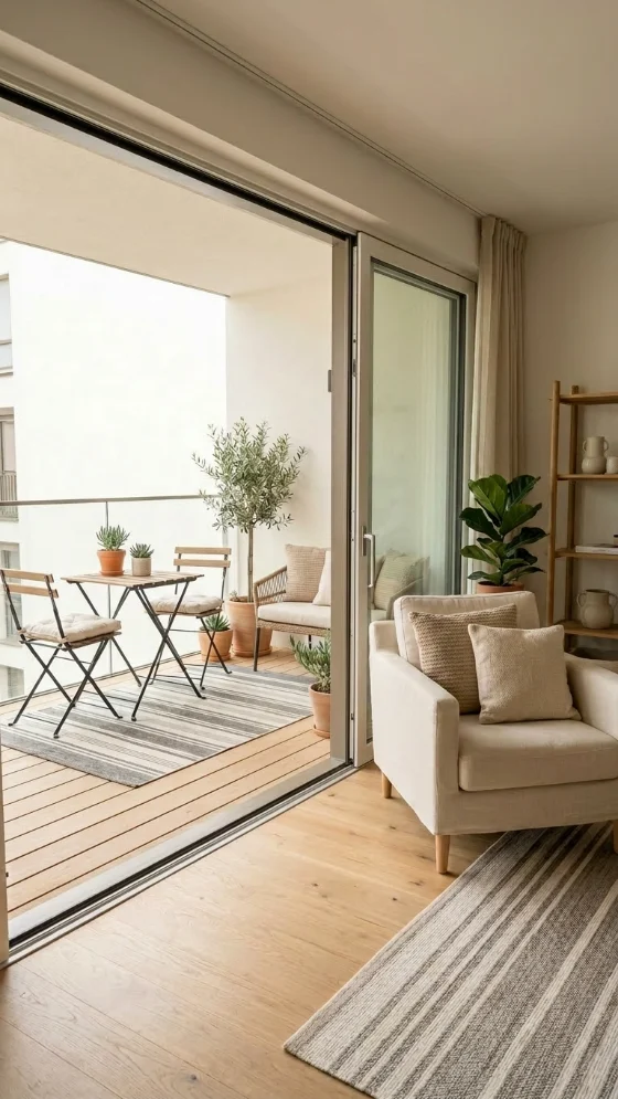 This works beautifully for apartment balcony decorating because it creates a defined, comfortable zone without visual clutter.