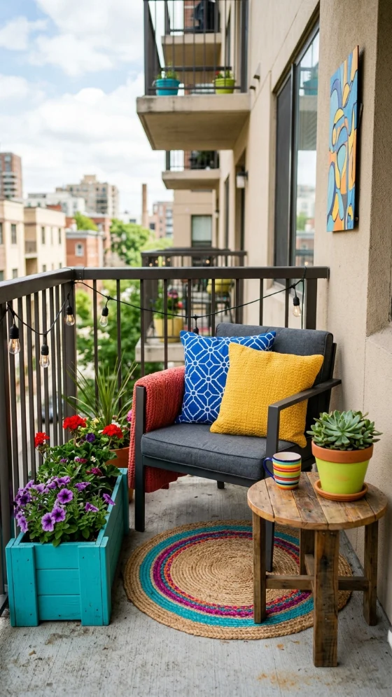 Even in a small setup, color can turn a basic balcony into something that feels cheerful and full of character.
