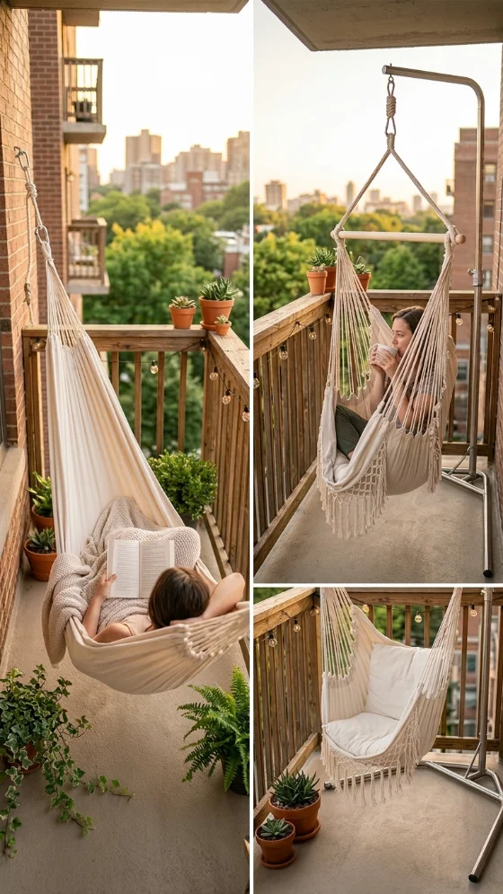 If you want your balcony to feel like a true escape, a hammock or hammock chair can make all the difference. Even a compact hanging chair creates a relaxed, laid-back vibe without taking up much floor space.