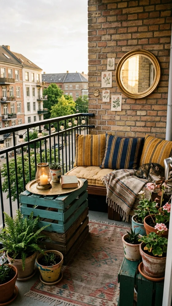 Adding a few personal, thrifted pieces can make your balcony feel more unique and lived-in. Think vintage trays, small mirrors, lanterns, or even repurposed crates turned into side tables.