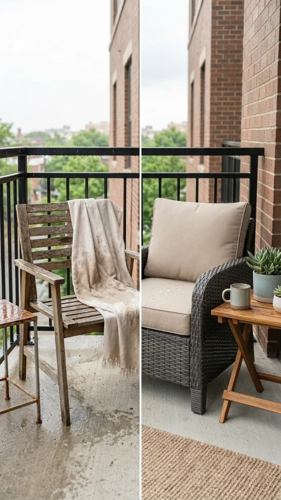 Choosing the right materials makes a big difference in how long your balcony setup lasts. Look for furniture made from treated wood, metal, or synthetic wicker, along with weather-friendly fabrics for cushions and throws.