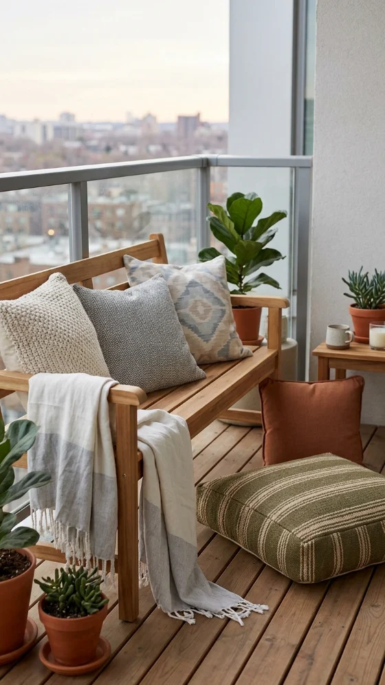 Soft furnishings are what make a balcony feel truly comfortable. Add weather-friendly cushions, a light throw, or even a small floor pillow to create a cozy, lived-in vibe.
