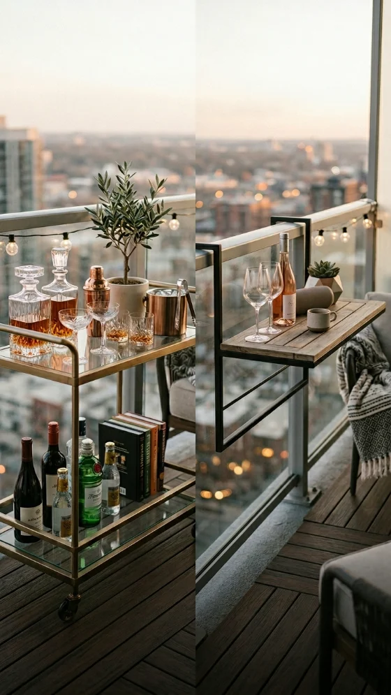 A small bar setup can make your balcony feel instantly more fun and functional. A slim bar cart or a railing-mounted shelf gives you space for drinks, snacks, or even a small coffee station without adding bulk.