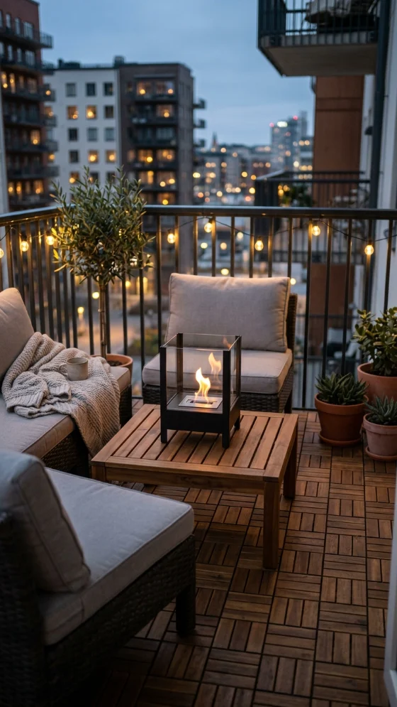 For cooler evenings, a compact fire pit or outdoor heater can make your balcony feel warm and inviting. Even a small tabletop version adds a soft glow and cozy atmosphere without taking up much room.