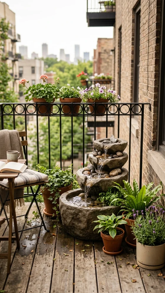 Adding a small fountain can bring a calming, peaceful feel to your balcony. The gentle sound of flowing water helps mask outside noise, which is especially helpful in busy areas.