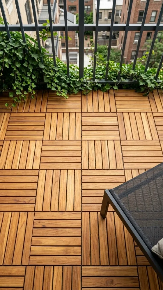 One of the easiest ways to upgrade a plain balcony is by fixing the floor. Outdoor rugs or interlocking deck tiles instantly cover dull concrete and make the space feel warmer and more finished.